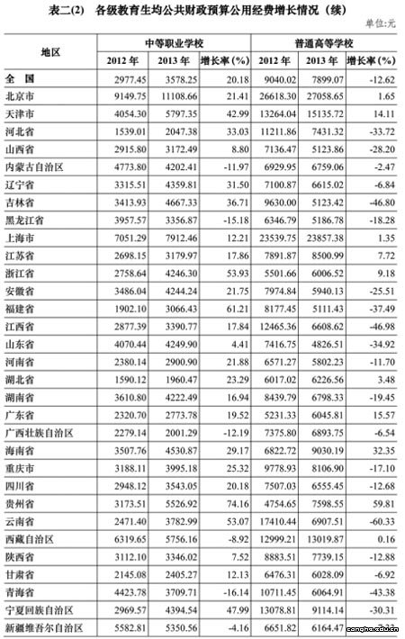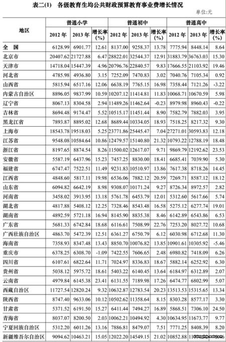 (2)全国普通初中为9258.37元,比上年的8137.00元增长13.78%。其中,农村为9195.77元,比上年的7906.61元增长16.3%。普通初中增长最快的是广东省(22.76%)。