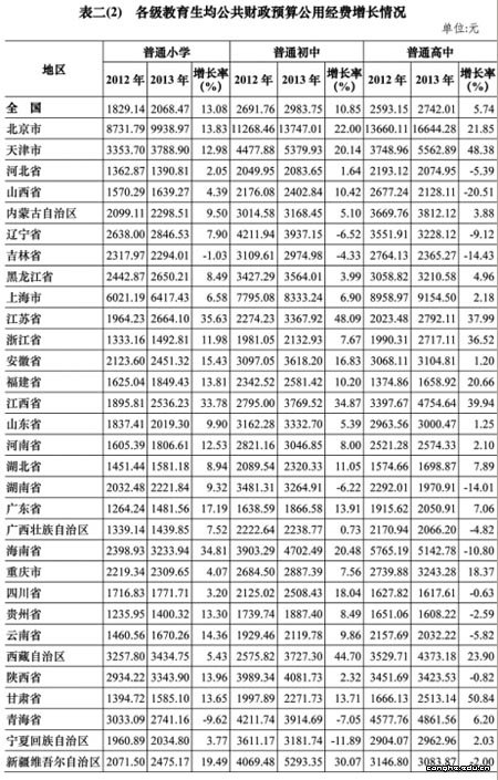 (3)全国普通高中为2742.01元,比上年的2593.15元增长5.74%。增长最快的是甘肃省(50.84%)。