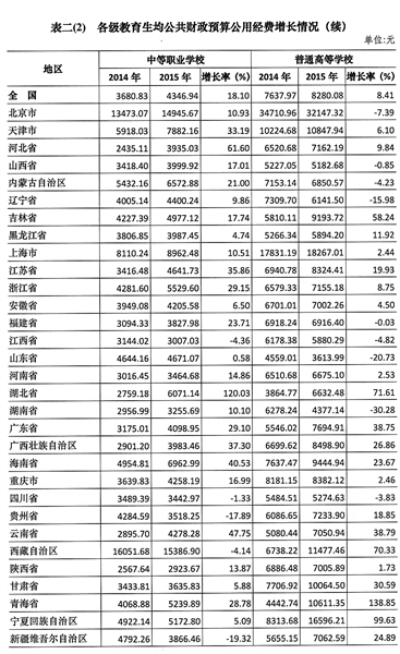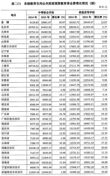 (5)全国普通高等学校为8280.08元,比上年的7637.97元增长8.41%。增长最快的是青海省(138.85%)。