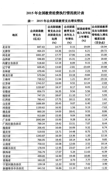 *按照完善政府预算体系的要求,2015年起将政府性基金中用于提供基本公共服务以及主要用于人员和机构运转等方面的11项基金转列一般公共预算。为计算同口径增幅,所涉及的2014年公共财政支出数据需增加这11项政府性基金,公共财政教育支出数据需相应增加地方教育附加和从土地出让收益计提的教育资金两项政府性基金,下同。