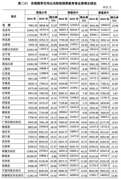 (3)全国普通高中为2923.09元,比上年的2699.59元增长8.28%。增长最快的是湖北省(104.54%)。