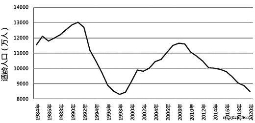 1984―2020年高等教育适龄人口变化趋势。(摘自中国教育在线《2011年高招调查报告》)