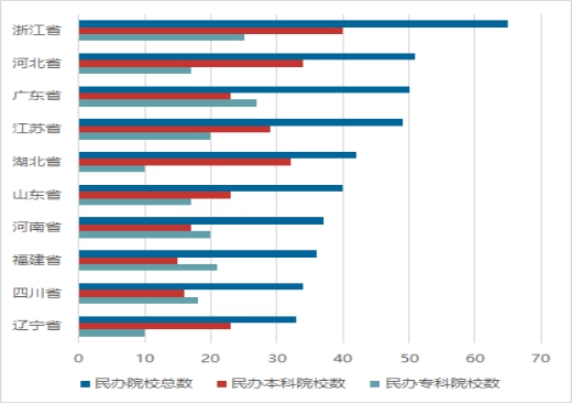 《报告》所涉及的民办高校主要指具备颁发学历文凭资格的民办高等学校和独立学院。改革开放以来,民办高等教育正在逐渐成长为我国高等教育体系中的重要力量。2017年,我国(港澳台地区除外)共有民办院校735所,其中本科院校417所,专科院校318所。民办院校数量最多的是浙江省,有65所,河北省排名第二,有51所,广东省以50所位居第三。广东省的50所民办高校中,本科院校23所,专科院校27所。