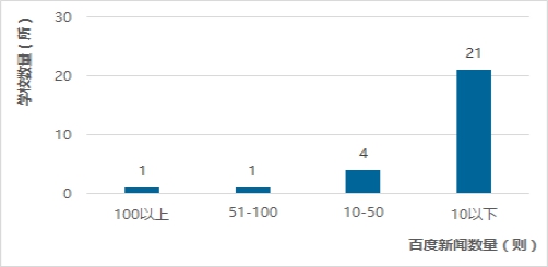 高职高专的品牌影响力评价采用一年内百度搜索新闻数量来衡量媒体对院校的关注度,采用百度指数来衡量大众对院校的知晓和关注度。在百度新闻中搜索2017年含有学校全称的新闻标题,新闻数量共计386则,平均百度新闻数量约为14则。其中,广东工商职业学院的新闻数量最多(145则),媒体关注度最高,其次是广州珠江职业技术学院(为80则)。