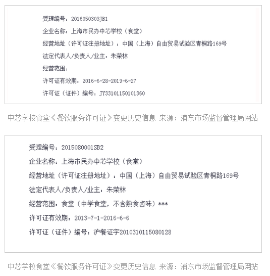 东弟查了浦东新区市场监督管理局公开信息,显示上海民办中芯学校(食堂)曾于2016年6月对其《食品经营许可证》进行了一次变更申请,变更后经营范围一栏空着;但网站上,之前学校变更的《餐饮服务许可证》等证,则明确显示其原经营范围为:食堂(中学食堂,不含熟食卤味);这是为啥呢?