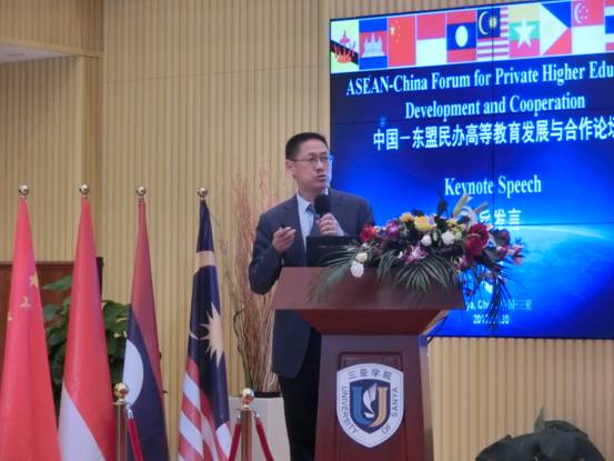 由中国---东盟中心(ACC)、东南亚教育部长组织高等教育与发展区域中心(SEAMEO RIHED)和中国民办教育协会高等教育专业委员会主办,三亚学院承办的“中国—东盟民办高等教育发展与合作论坛”于11月30日在海南省三亚市隆重举行,来自我国和越南、柬埔寨、泰国、菲律宾、马来西亚等东盟相关国家的30多所知名民办高校的100多名代表参加了本次论坛。中国—东盟中心秘书长杨秀萍、海南省教育厅副厅长孔令德、东南亚教育部长组织高等教育与发展区域中心主任婵塔薇.苏佳塔侬、三亚市副市长戴玉明、中国民办教育协会高等教育专业委员会理事长季平、中国—东盟教育周组委会秘书长刘宝利等相关领导参加了会议。本次论坛旨在搭建中国和东盟民办高校间交流与合作平台,分享各国民办高校自身发展的成功经验和合作案例,探索建立中国---东盟民办高校人文交流与教育合作的长效机制。我校副校长陈新民教授受论坛组委会的邀请参加了本次论坛,并作了题为《行业学院:民办高校转型发展之路径》的主旨演讲。